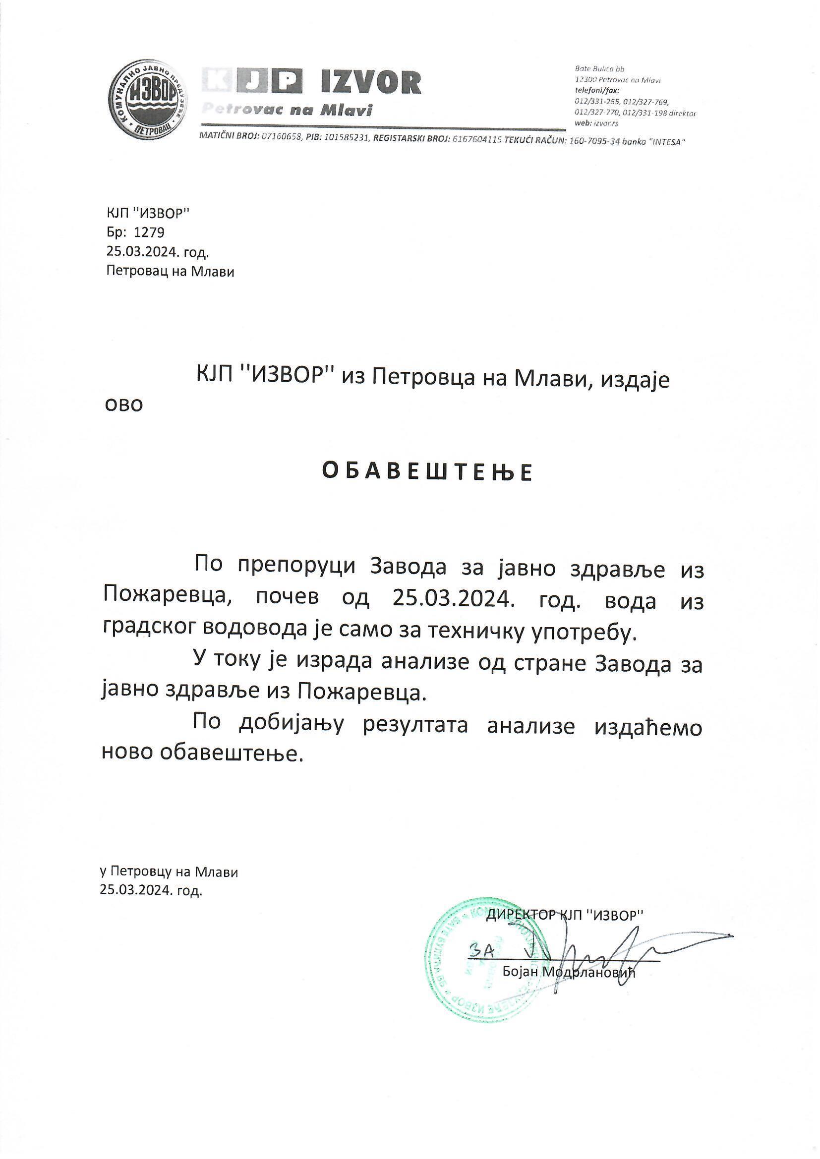 На основу предмета број 861 од 01.04.2024. године и препоруке Завода за јавно здравље Пожаревац обавештавамо вас да је вода која долази из нашег водоводног система ,због непредвиђених околности привремено намењена искључиво за санитарну и хигијенску употребу.Може се користити за све санитарно хигијенске потребе (одржавање личне и хигијене радног и животног простора),а за пиће и припрему хране треба сачекати.